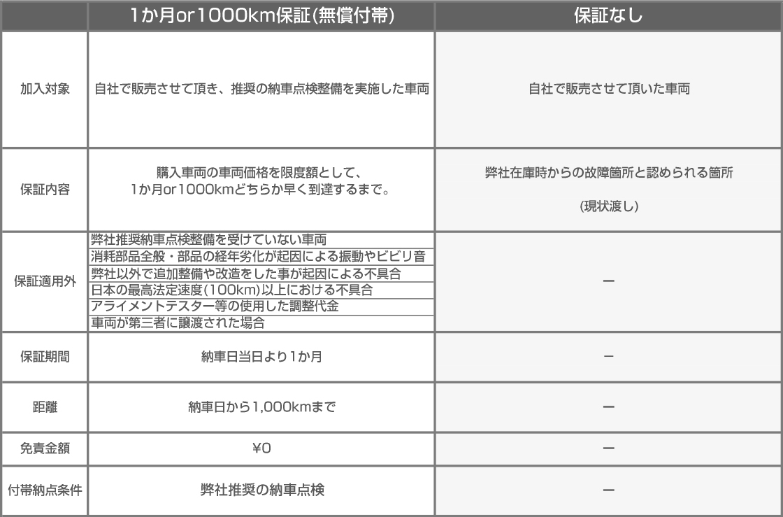 1カ月 or 1000km 無料保証付(弊社推奨納車整備実施車両)