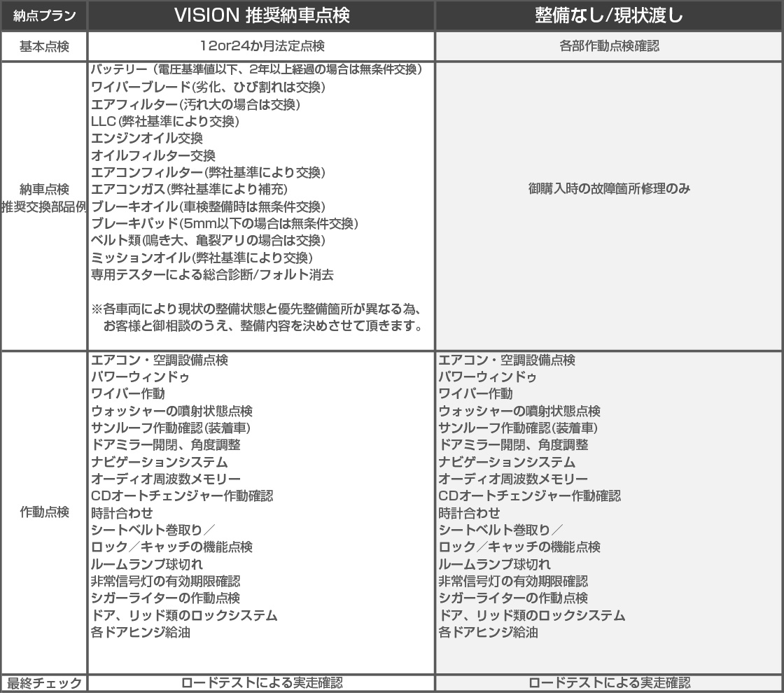 弊社基準の推奨整備パック (法定点検+消耗品交換整備)をご用意させて頂いておりますので、ご依頼頂いた際には 法定点検整備を実施した箇所に1か月or1000km限度の無料保証を付帯させて頂きます。